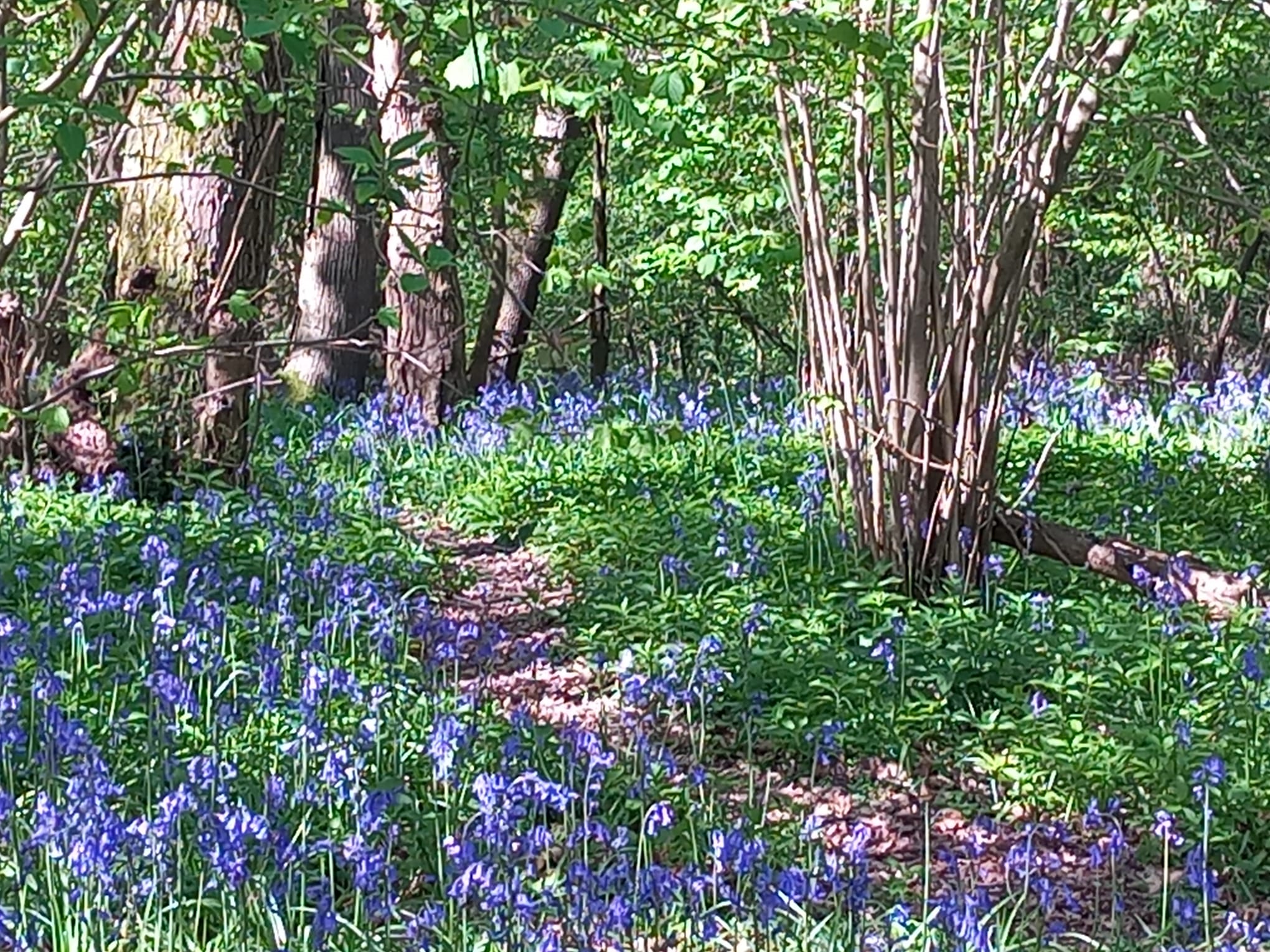 The walk starts from the west end of the Holloway road. Towards the west end of the road, as you leave the housing estate there are a couple of laybys on the left with the start of a public footpath between them heading south. The start of the walk takes us along that footpath. The path takes us along the ridge of a hill where we get good views over Pershore town, and Bredon Hill. We pass across a couple of hills and then the path tightens between a fence and hedgerow and takes a small dogleg. The path reaches a bridal via a gate. We turn right here and follow the bridle path westward towards the woods. After about 100m the bridleway enters the woods via a gateway. We continue on the bridleway down a slope until we meet the main path though the woods. At this point we turn left and follow the path up the hill. We follow the path past the military shooting range on the left. In April, some of the best displays of bluebells can be seen from the edge of the range on the right side of this path. After about 600m the path reaches a junction where a couple of other paths lead out of the woods. At this point we turn around and retrace our steps back to the junction of the main path and the bridle path we followed earlier. At the junction instead of turning left back along the bridle path, we continue north on the main path through the woods. We follow this path until we reach the end of the woods. At this point the is a gate on the right and a path that leads eastward outside and along the north edge of the woods. We follow this path and it takes us up onto the path we initially follow along the top of the hill. Turning left, we follow the path back to our starting point